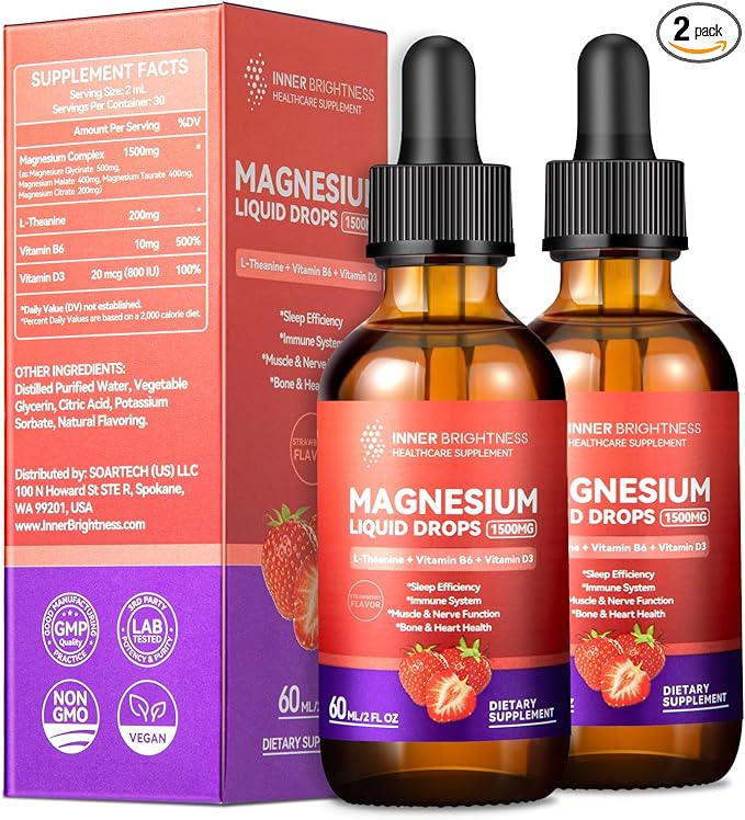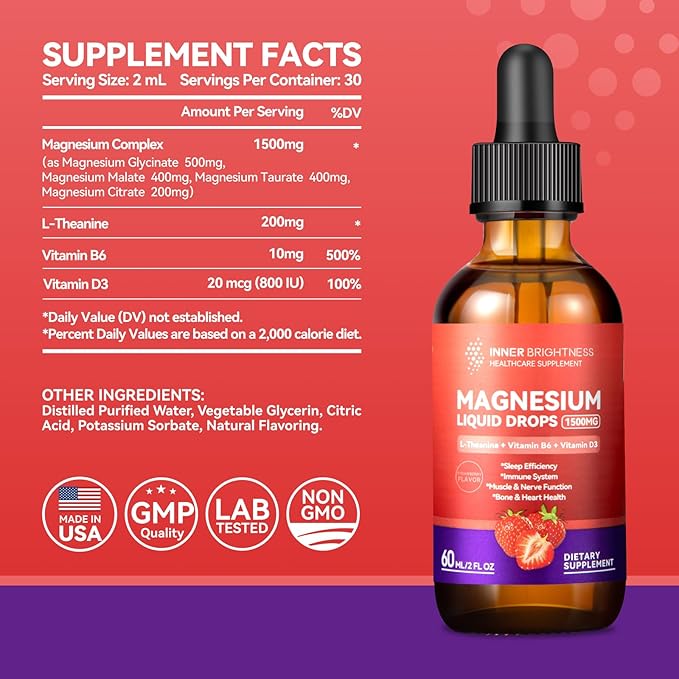 Magnesium Glycinate Liquid Drops 1500mg with Magnesium Citrate & Taurate, L-Theanine, Vitamin D3, B6 - Supports Calm, Sleep, Muscle Relaxation, Leg Cramps & Energy, Strawberry Flavor, 60mL 2 Pack