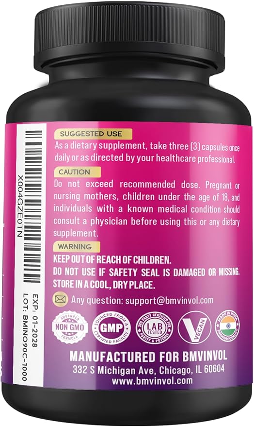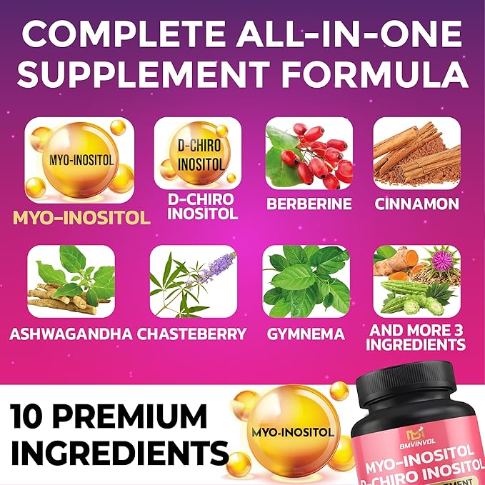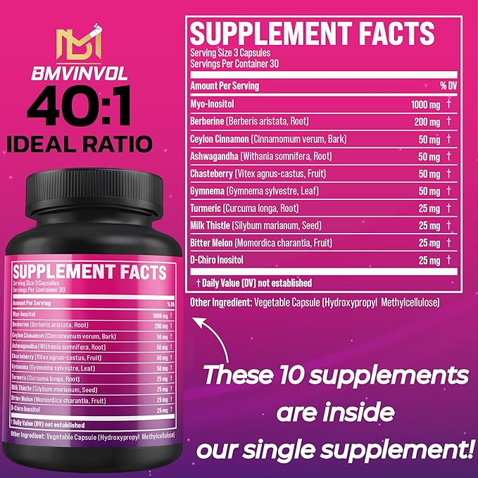 BMVINVOL Inositol Supplement - Myo-Inositol and D-Chiro Inositol Ideal 40:1 Ratio - Plus Berberine, Cinnamon, Ashwagandha + 5 More - 90 Capsules