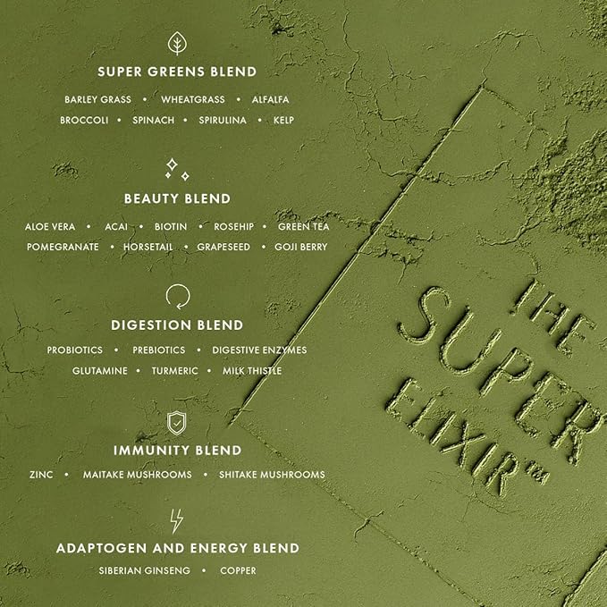 - DAILY SUPER GREENS HEALTH SUPPLEMENT: The Super Elixir is a daily health supplement formulated using a combination of whole foods, super greens, herbal extracts, vitamins, minerals, and probiotics to help support overall gut health, immunity, energy, and the appearance of healthy skin, hair, and nails. Our blend is 100% gluten free, vegan, dairy free, non gmo, and Australian made. Available in four great tasting flavors: lemon ginger, blood orange, original pineapple & line, and unflavored.