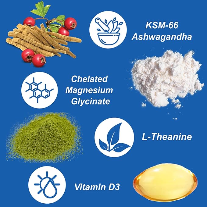 - Main Ingredients: Organic Ashwagandha -300mg, L-Theanine -400mg, Magnesium Glycinate -100mg, Vitamin D3 -1000 lU