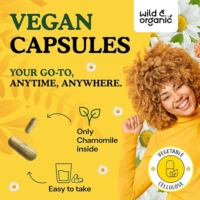 - Plant-Based: Wild & Organic chamomile supplement uses plant-based ingredients, including a vegetable cellulose coating, making it suitable for vegans.