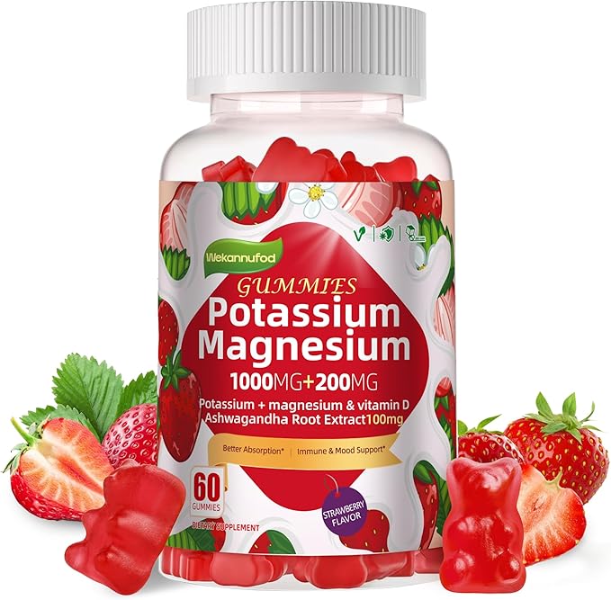 Potassium Magnesium Gummies,High Absorption Magnesium Glycinate,B6,D3,Potassium Citrate for Leg Cramps,Muscle,Electroyte for Adults Kids,Sugar-Free, 60 Gummies (Strawberry Flavor)