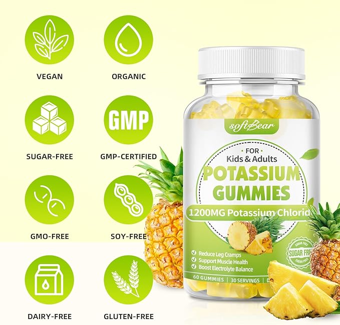 - Sugar Free Potassium Supplement Gummies: These ingredients of potassium chloride supplement gummies are vegan, non-GMO, gluten-free, and won't increase physical burden. softbear potassium gummies are easy to chew and swallow, perfect for adults & kids, women & men