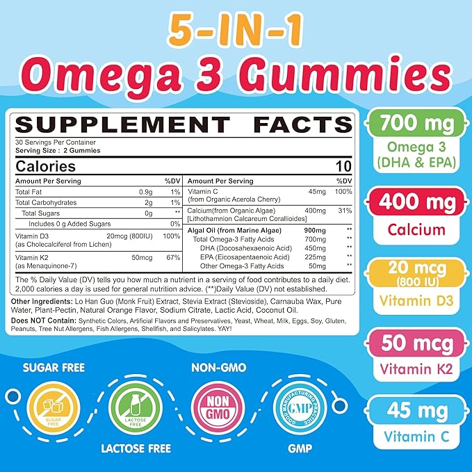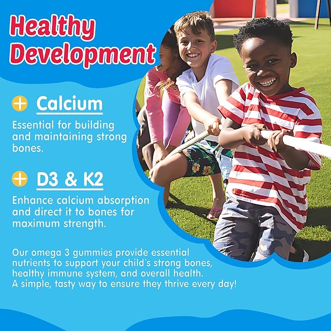 - 【Kids Omega 3 Supplement with Essential Nutrients】Hey there, parents! Are you Looking for a simple way to support your baby's overall health? Our Omega 3 gummies are packed with essential nutrients like Calcium, Vitamin D3, and K2—a powerhouse trio that promotes strong bones and teeth while also supporting the optimal use of calcium. Plus, Vitamin C is added to support your kids' immunity. Together, these nutrients are vital for the healthy development of your little champions!