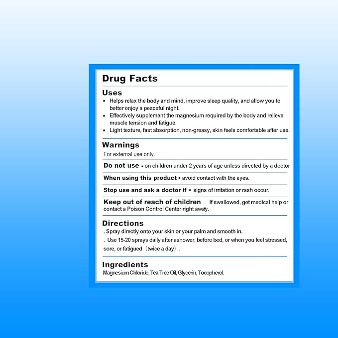 - 【Easy to Use】Magnesium Chloride Oil Spray is easy to use and suitable for taking with you. You can use it anytime, whether at home, in the office or when traveling. Spray 4-5 times on the problem area or the sole of the foot, and massage until fully absorbed. Our Magnesium Oil Spray is designed with a safety seal to ensure that it will not leak. It is convenient to use anytime, anywhere.