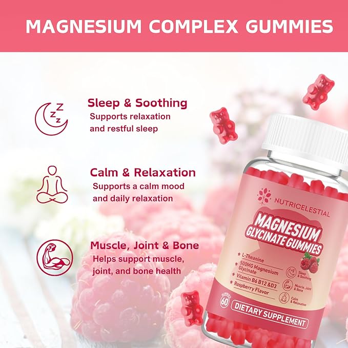 - NutriCelestial Magnesium Glycinate Gummies: Each serving provides 500mg of magnesium glycinate, sourced from fruits and natural ingredients. These vegetarian-friendly gummies are easy to take and designed to support your daily magnesium needs
