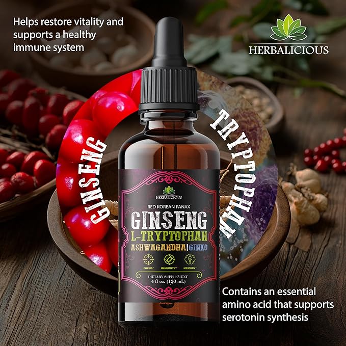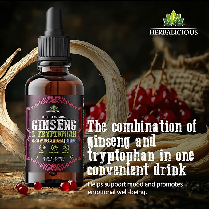 Ginseng L-Tryptophan Liquid - Ashwagandha, Ginkgo, Red Korean Panax - Drops Dietary Supplement Natural Stress Relief, Mood Booster, Sleep Aid & Calming Support - Non-GMO Vegetarian Formula (4 fl oz )