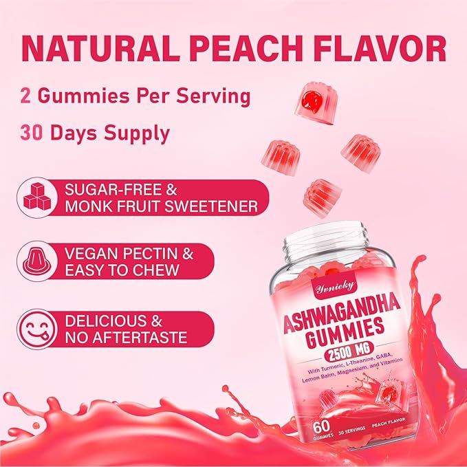 - NATURAL, DELICIOUS & SUPERIOR QUALITY: Our ashwagandha gummies for women and men features PEACH FLAVOR, sweetened with MONK FRUIT, making them SUGAR-FREE and no aftertaste. Made with safe, edible pectin, they are easy to chew without sticking together, easuring EASY TO D IGEST and NO BURDEN on your body. FREE FROM GMOs, gluten, gelatin, artificial colors, flavors, or preservatives. Certified by GMP and rigorously tested by third parties, we guarantee the purity and potency of each gummy.