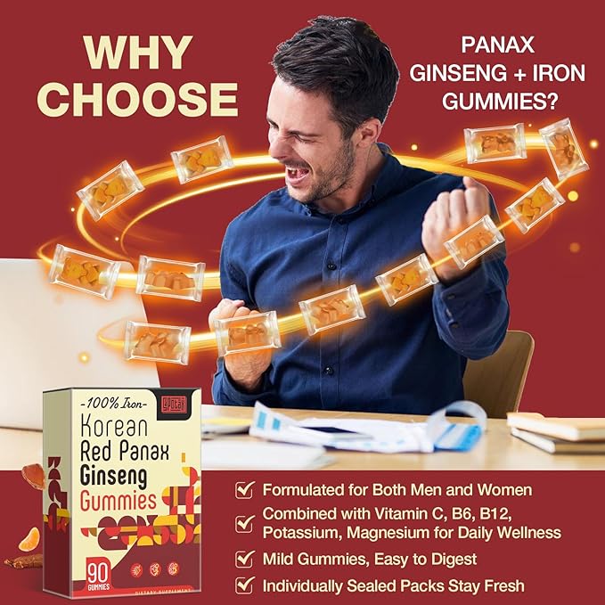 Korean Red Panax Ginseng Supplement Gummies - Iron Supplements for Women & Men - Iron Gummies with Vitamin C, B6, B12, Potassium & Magnesium, Vegan - 180 Count
