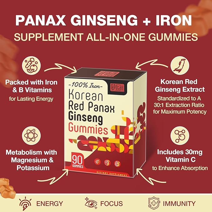 Korean Red Panax Ginseng Supplement Gummies - Iron Supplements for Women & Men - Iron Gummies with Vitamin C, B6, B12, Potassium & Magnesium, Vegan - 90 Count