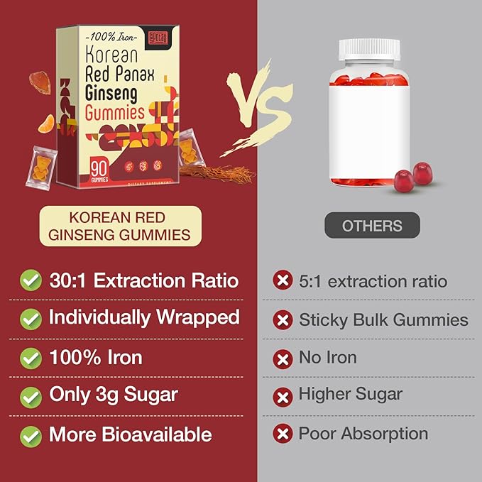 - Premium Ginseng: Crafted with Korean Red Panax Ginseng, our gummies offer a unique flavor experience. The chewable form minimizes the unpleasant taste associated with traditional tablets, making them a convenient and tasty supplement option