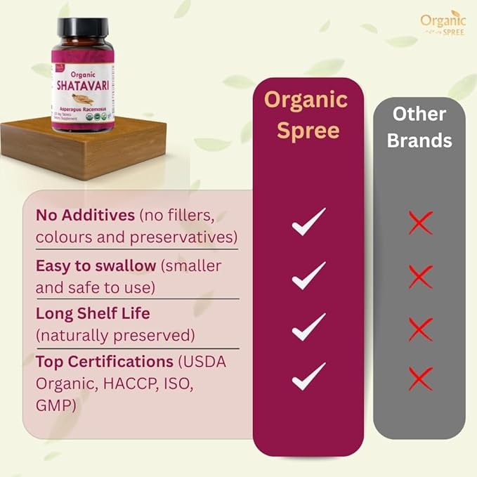 - Made with Goodness : Organic Spree Shatavari Tablets are USDA Organic Certified, Vegetarian-friendly, and free from artificial colors, flavors, and preservatives. Enjoy the benefits of Organic SHATAVARI in every tablet.*
