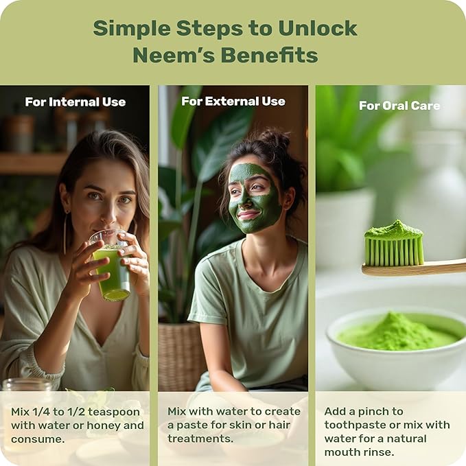 - Pure Neem Leaf Powder: Made from high-quality neem leaves, packed with antioxidants, antibacterial, and antifungal properties for natural health support