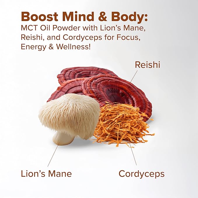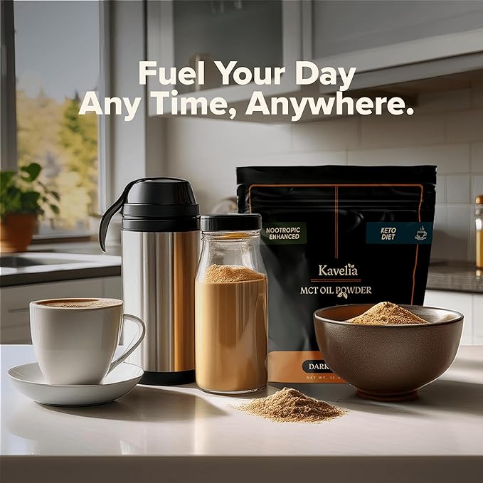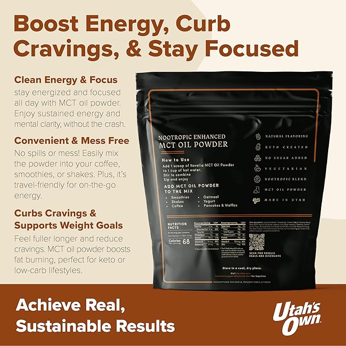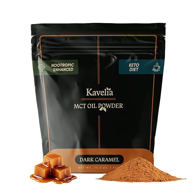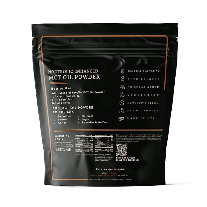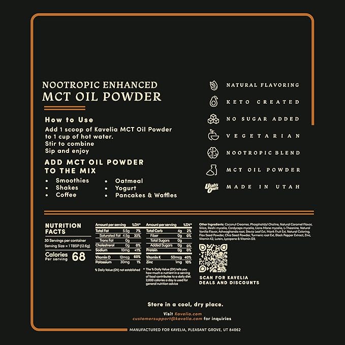 - BOOST YOUR ENERGY AND FOCUS: Kavelia MCT Oil Powder. Each scoop provides 9 Grams of MCT per serving. This non-dairy ketogenic vegan coffee creamer is enhanced with nootropic mushrooms to help improve cognitive function and provide a natural energy boost. Perfect for starting your day or as a pre-workout boost.