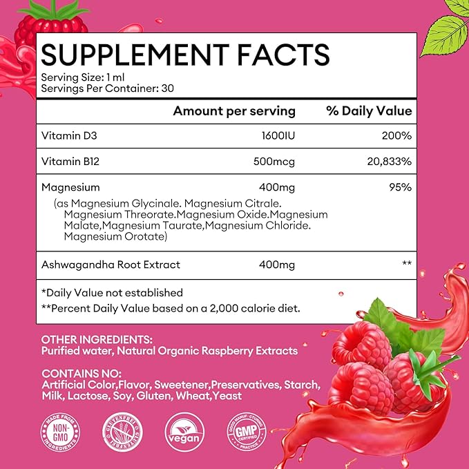 (3 Pack) Magnesium Liquid - 8 in 1 Magnesium Complex Drops with Magnesium Glycinate,Citrate,Malate,Taurate,Magnesium Complex Supplement for Brain,Night,Muscle,Bone,Cramps, Raspberry Flavor