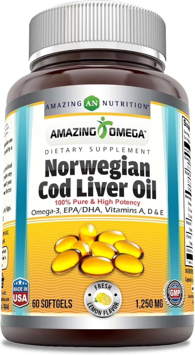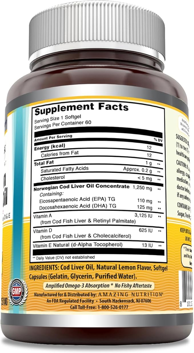 Amazing Omega Norwegian Cod Liver Oil 1250 Mg Softgels Supplement | Omega-3, EPA, DHA, Vitamin A, Vitamin D & Vitamin E (Lemon | 60 Count)