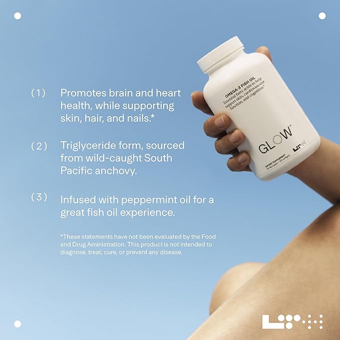 - Omega-3 Supplement: Glow Omega-3 Fish Oil is a fish oil supplement in triglyceride form, sourced from wild-caught South Pacific anchovy