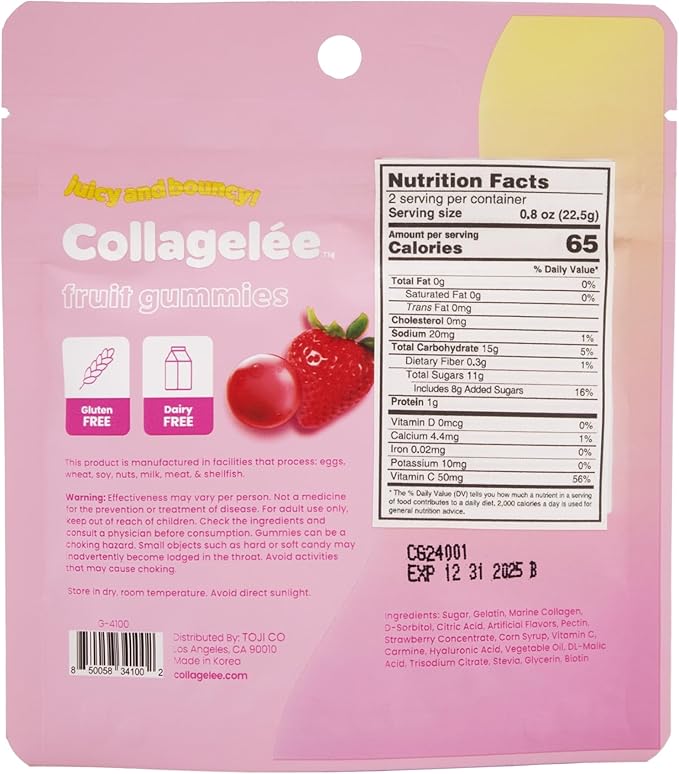 - Beauty Never Tasted So Good: Meet Collagelée, where delicious fruit gummies meet rejuvenating marine collagen for beautifully juicy skin! Our Collagen-infused fruit gummies aren’t just tasty, they’re your secret weapon for luscious locks, bouncy skin, strong nails, and a boosted immune system.