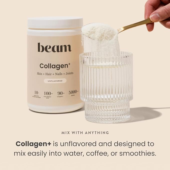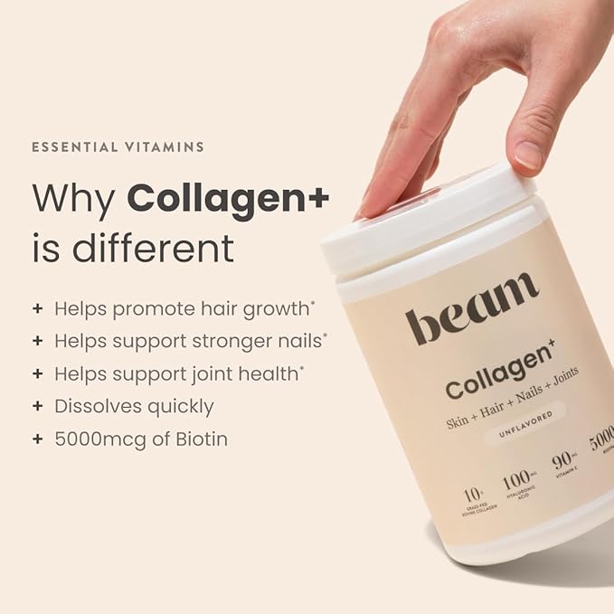- HEALTHY SKIN, HAIR & NAILS WITH COLLAGEN PEPTIDES – Beam Collagen Powder is a powerful supplement for skin health, hair growth, and nail strength. Packed with hydrolyzed collagen peptides, it helps improve elasticity and hydration for radiant skin and shiny hair, making it a must-have addition to your beauty routine.
