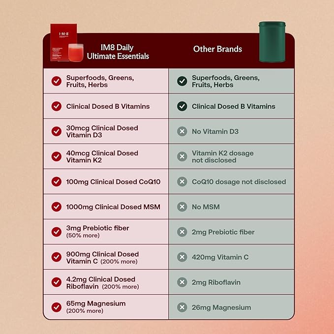 - DAILY ULTIMATE ESSENTIALS: Your daily foundation for energy, focus, digestion, and whole-body wellness support—in one delicious and easy-to-mix drink. IM8 Daily Ultimate Essentials is a science-backed, all-in-one supplement for men and women designed to simplify daily nutrition with a science-backed formula. With 92 nutrient-rich ingredients, including essential vitamins, minerals, superfoods, and clinically studied doses of CoQ10 and MSM, IM8 supports hydration, digestion, energy metabolism, immune function, and overall well-being, including key nutrients for hair, skin, nails, joints, muscles, and heart health.