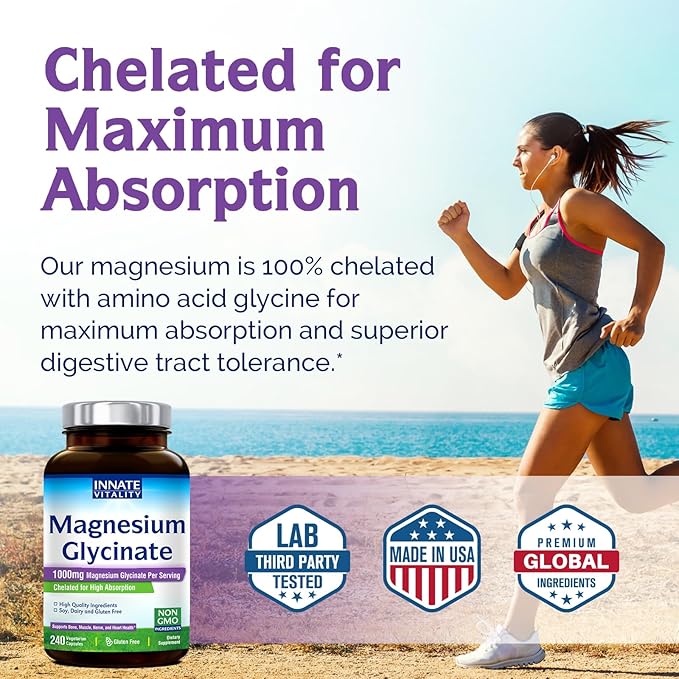 Innate Vitality Magnesium Glycinate 1000mg Per Serving | 140mg Elemental Magnesium Supplement - High Absorption, Non Buffered, Non-GMO & No Gluten - Nerve, Muscle, Bone & Heart Health - 240 Caps