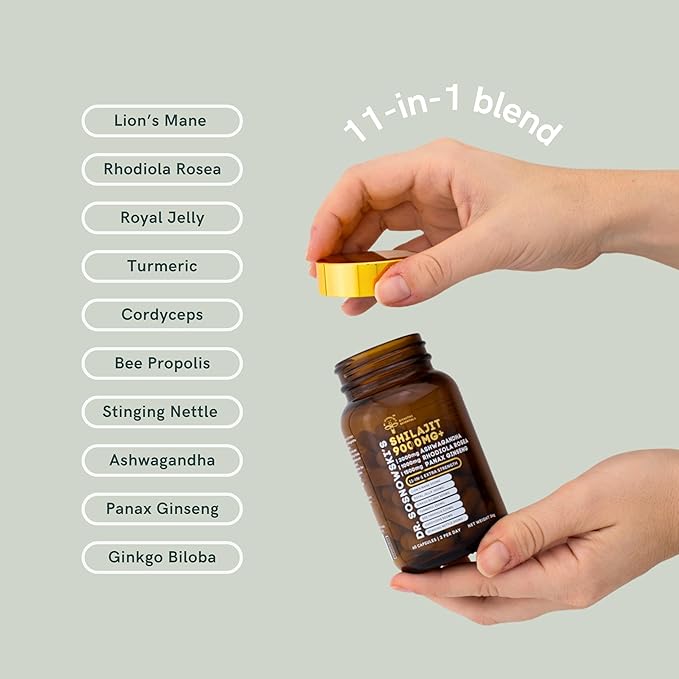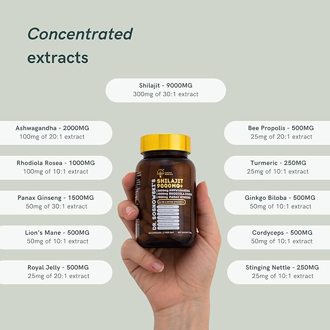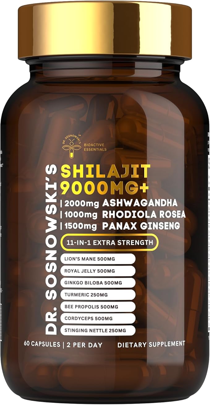 - CAREFULLY ENHANCED SUPERBLEND: Dr. Sosnowski's BioActive Shilajit blend is a unique 11-in-1 formula enhanced with potent extracts of Ashwagandha, Rhodiola Rosea, Ginseng Mushroom, Cordyceps Mushroom, Ginkgo Biloba, Lion's Mane Mushroom, Stinging Nettle, Turmeric, Royal Jelly and Bee Propolis, each carefully selected for its own naturally-occuring properties, vitamins, minerals or nutrients. Bee Propolis is included as Dr. Sosnowski's long-time hero ingredient, containing over 300 beneficial compounds, antioxidants and vitamins.