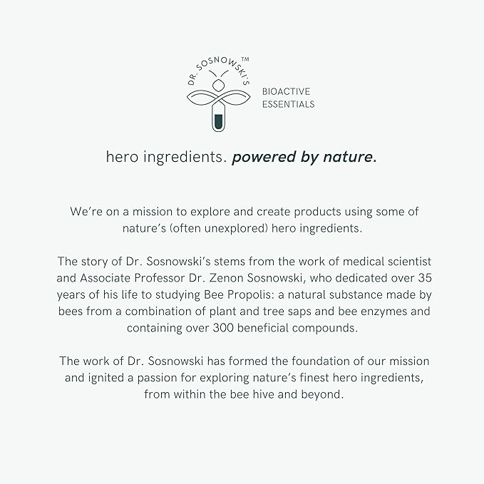 - BIOACTIVE ESSENTIAL: We’re on a mission to create products using some of nature’s (often unexplored) hero ingredients. The story of Dr. Sosnowski’s stems from the work of medical scientist and Associate Professor Dr. Zenon Sosnowski, who dedicated over 35 years of his life to studying Bee Propolis: a natural substance made by bees from a combination of plant and tree saps and bee enzymes and containing over 300 beneficial compounds. The work of Dr. Sosnowski has formed the foundation of our mission and ignited a passion for exploring nature’s finest hero ingredients, from within the bee hive and beyond.
