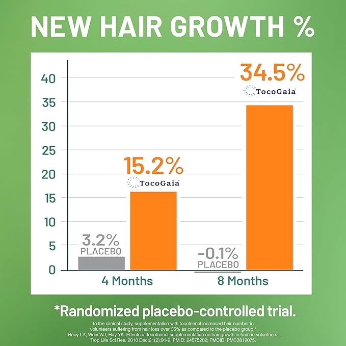 - In the double-blind clinical study of TocoGaia, supplementation with tocotrienol increased new hair growth over 34% in male and female volunteers suffering from hair loss, as compared to the placebo group.*