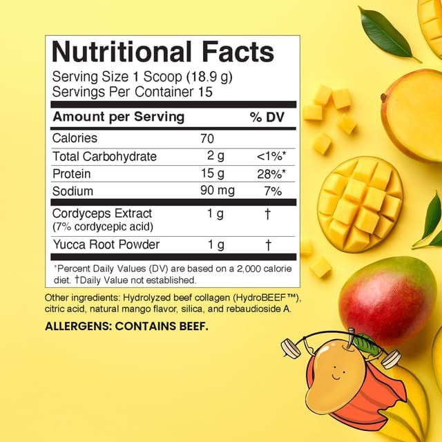 Hydrolyzed Beef Collagen Peptides Powder with Cordyceps & Yucca Root - Supports Muscle Recovery, Gut & Joint Health - Mango Flavor Protein Powder, 10oz