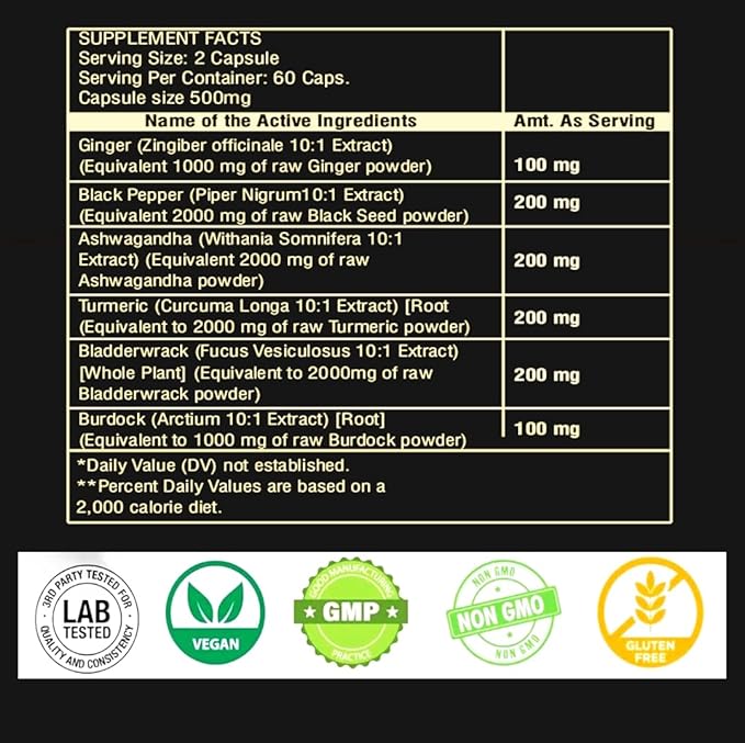 Premium Ashwagandha Extract Capsule with Ginger, Turmeric, Black Pepper, Bladderwrack, Burdock - 60 Capsule for 1 Month - Strength, & Immune Support