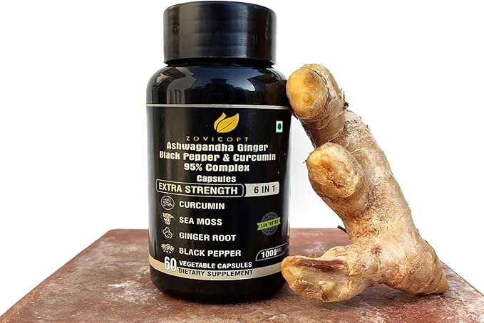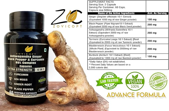 - ✅ Zovicopt Premium Ashwagandha Extract Capsules (60 Count - 1-Month Supply): A powerful dietary supplement designed to support overall strength, energy, and immune health. Each capsule contains a unique 6-in-1 blended formula, including Ashwagandha, Ginger, Turmeric, Black Pepper, Bladderwrack, and Burdock,
