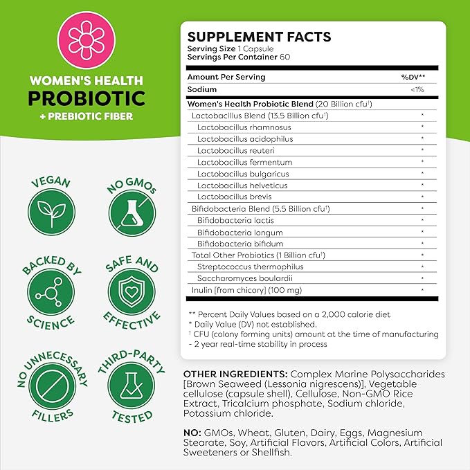 - WOMEN'S PROBIOTIC SUPPLEMENTS: Safeguard your vaginal and gut health and align with healthier living goals with our Women's Probiotic Capsules! This vaginal flora probiotic supplement features 12 scientifically-studied probiotic strains and a proprietary delivery system to provide broad-spectrum yet targeted support for women looking to support their vaginal, urinary tract, immune, and digestive health on a daily basis