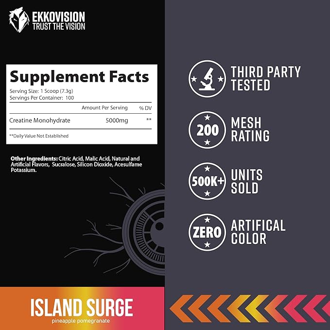 - EXOTIC FUSION OF TROPICAL FRUITS: Island Surge offers a bold and refreshing blend of tropical flavors, making it a perfect choice for your daily creatine intake. Its micronized texture ensures smooth mixing into water, shakes, or smoothies without clumps.