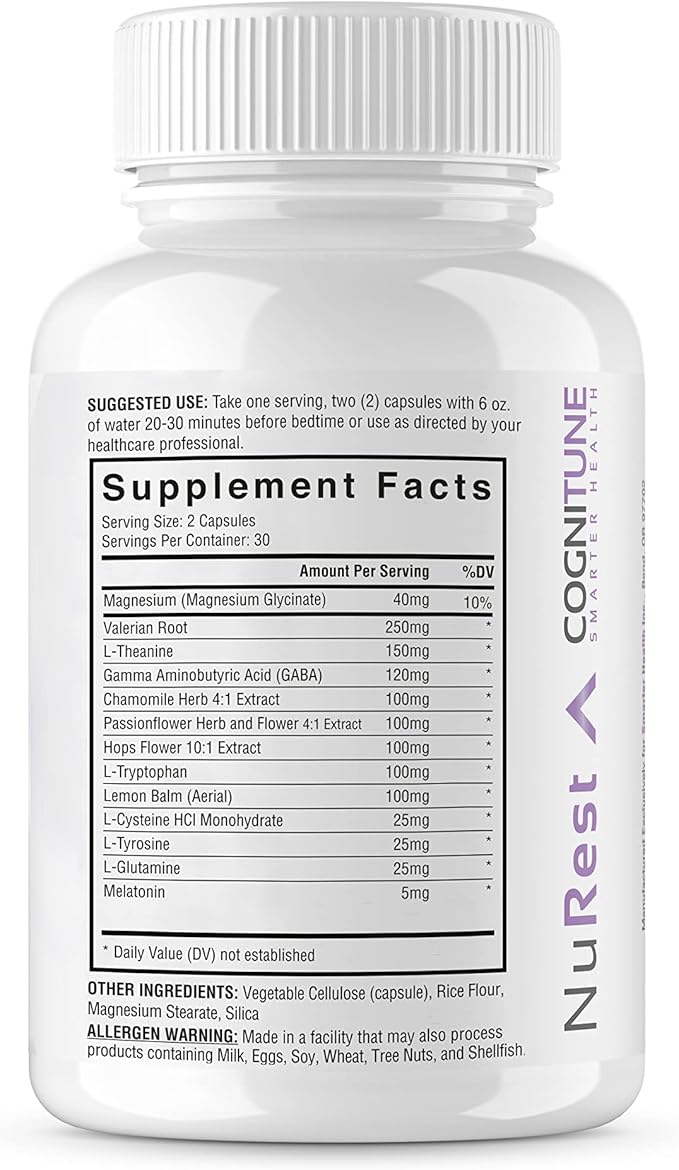 - Highest Quality & Satisfaction Ensured - NuRest is made in the USA in an FDA Registered facility following strict GMP standards. It is Non-GMO, Vegan Friendly, Gluten Free, Soy Free, Allergen Free, Third Party Tested, and Lab Verified. This ensures you are getting a high-quality sleeping aid that you can trust.