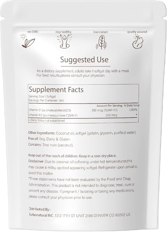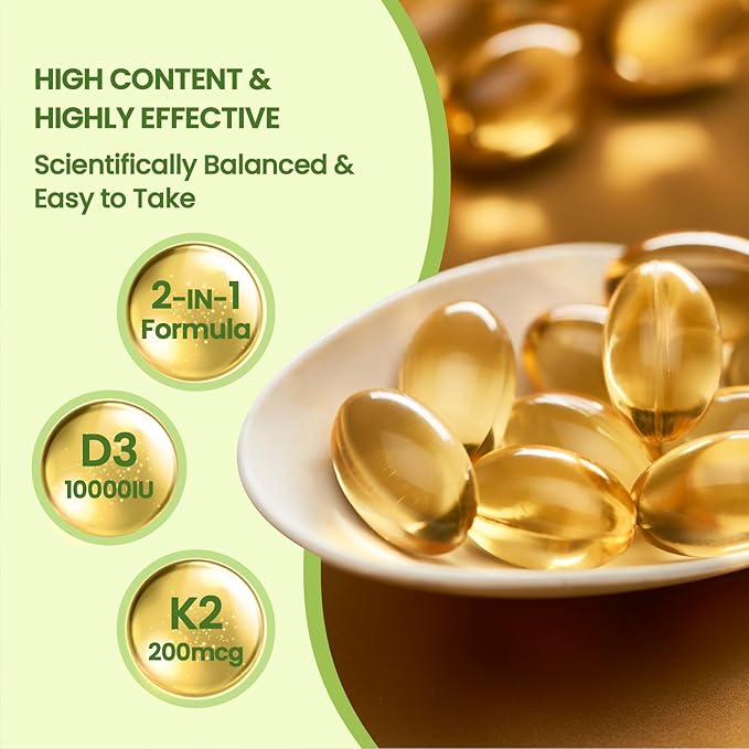 - Easy to swallow: Each sachet contains 300 softgels.QVQ D3 K2 Supplement combines 10,000 IU of vitamin D3 and 200 mcg of vitamin K2.Comes in a softgel form that is easy to swallow and effectively absorbed.One softgel per day ensures optimal levels of two key vitamins for a more complete body.