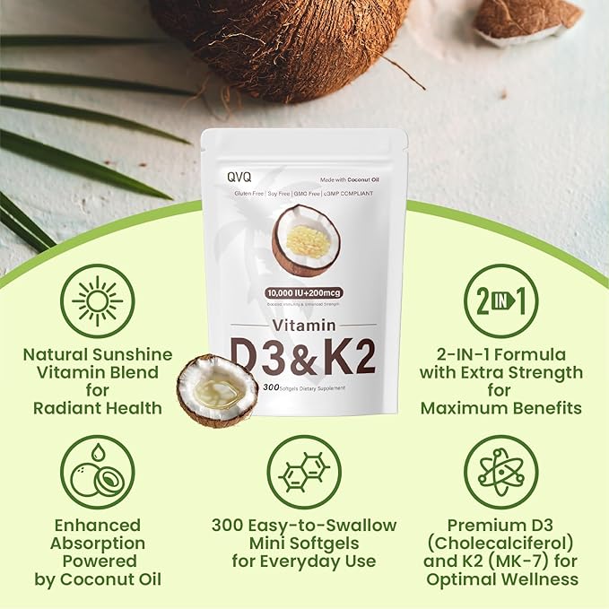 - Improved Bioavailability:QVQ 2 in 1 Vitamin D3 + K2 coconut oil softgels. An efficiently absorbed formula that contains D3 as cholecalciferol and K2 in its top grade menaquinone (MK7) form. Vitamin D3 and K2 are better absorbed with fat, and Healthy Coconut Oil provides the optimal fat for enhanced nutrient absorption.