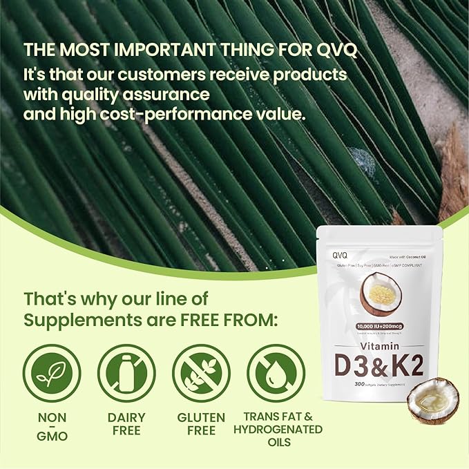 - Natural premium formula: QVQ vitamin d3 k2 is made with a non-GMO premium formula that is free of soy, gluten, preservatives, flavors, they are vegan. Manufactured according to GMP standards and third-party tested for safety and quality.