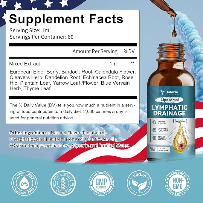 - 11 IN 1 Formula: Totaria's exclusive formula is extracted from 11 natural herbs, feel the natural power from European Elder Berry, Burdock Root, Calendula Flower, Cleavers Herb, Dandelion Root, Echinacea Root, Rose Hip, Plantain Leaf, Yarrow Leaf/Flower, Blue Vervain Herb, Thyme Leaf. Comprehensively protect your lymphatic system including lymphatic vessels, lymph nodes, spleen, thymus, tonsils, etc.