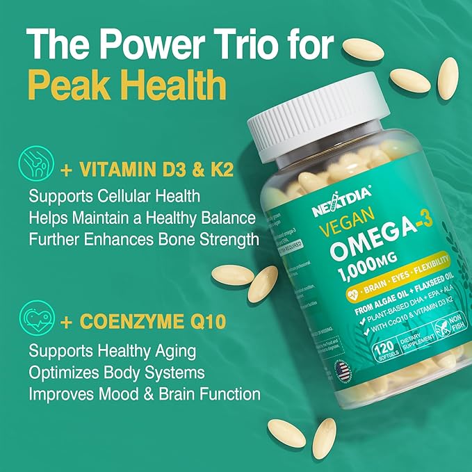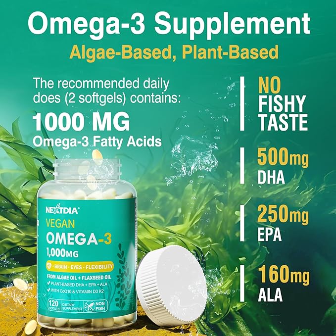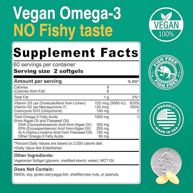 - 【Vegan Omega 3 1000mg】DHA, EPA, and ALA offers a full-spectrum omega-3 profile, maximizing the diverse benefits of each fatty acid. Vegetarian sources of these nutrients include algae oil (for DHA and EPA) and flaxseed oil (for ALA). * Better plant-based omega3 option, more sustainable and eco-friendly, with no fishy aftertaste.