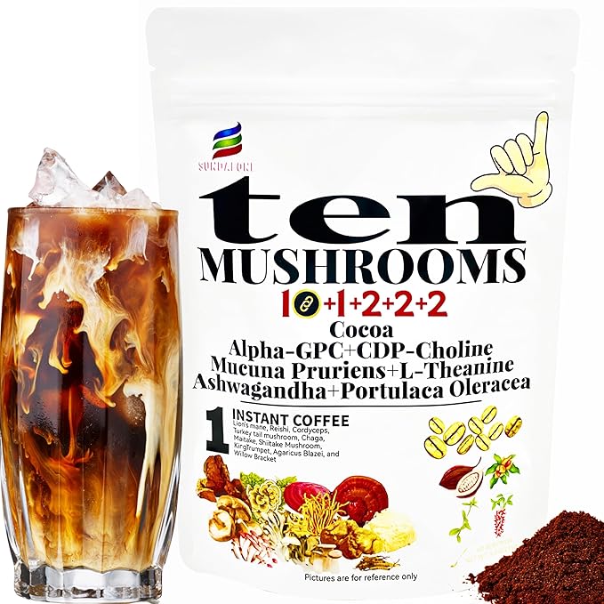 SUNDAFONE 17-in-1 Mushroom Coffee Powder with L-Theanine,Alpha-GPC,Ashwagandha for Boost Brainpower,Sharpen Focus,Lift Mood,Ease Stress,Support Heart & Immunity, 60 Servings Instant 10 Mushroom Coffee