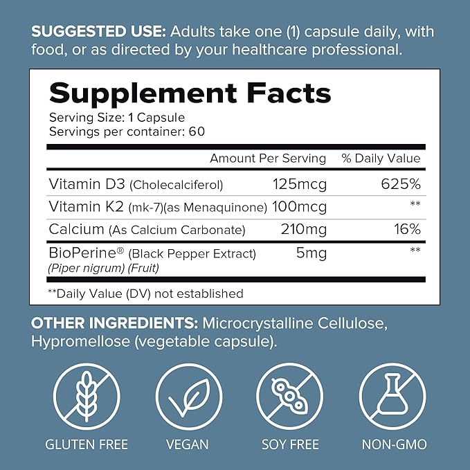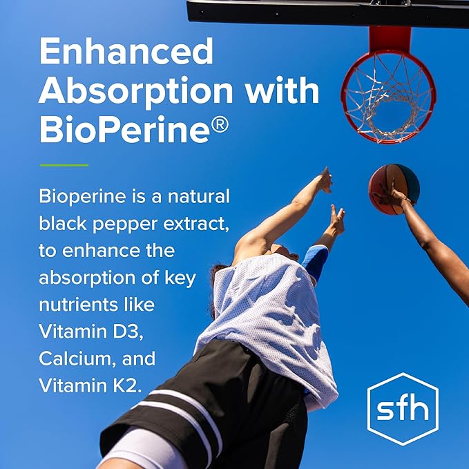 - Enhanced Absorption with BioPerine: The inclusion of BioPerine (black pepper extract) helps improve nutrient absorption. BioPerine has been shown to enhance the bioavailability of vitamins and minerals, ensuring your body can effectively utilize Vitamin D3, K2, and Calcium for maximum benefit.