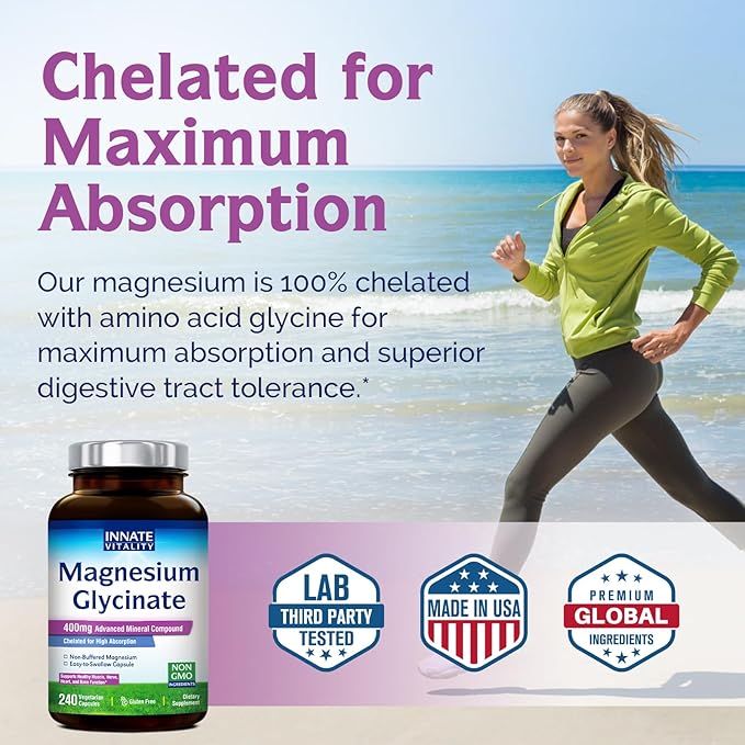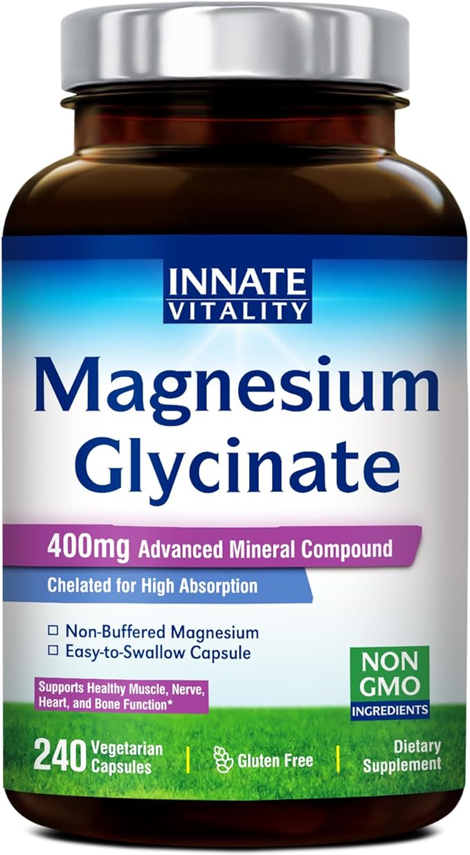 Innate Vitality Magnesium Glycinate 400mg, Non Buffered & High Absorption Magnesium Supplement for Sleep, Relaxation, Muscle & Bone Health for Men & Women, Non-GMO, No Gluten, 240 Vegan Capsules