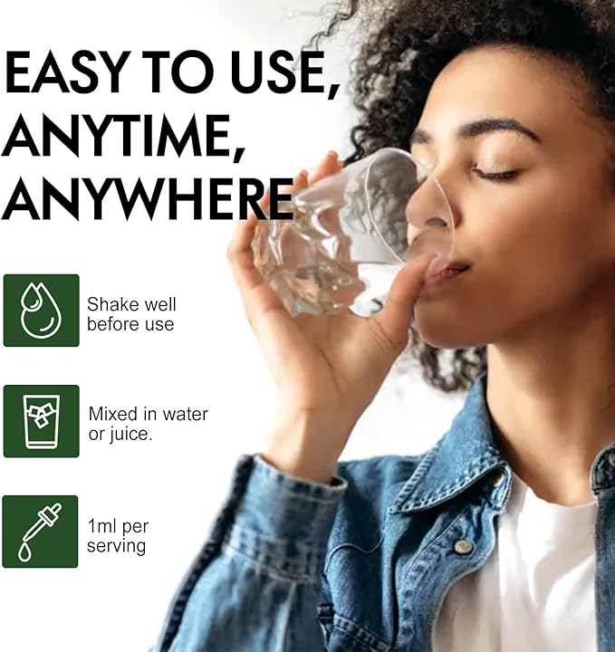 - EASY TO USE: Say goodbye to hard-to-swallow pills and capsules. Our portable, eco-friendly glass bottle drops fit easily into your daily routine. Simply Mix 1 ml in water or juice, 1-2 times daily, or as needed. Shake well before use. Support your wellness naturally, anytime, anywhere.