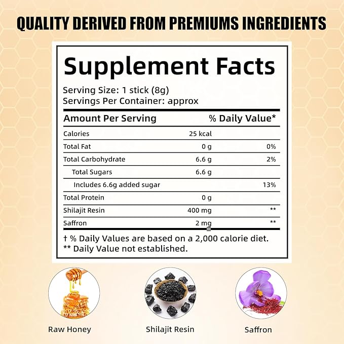 - Pure Himalayan Shilajit:The honey sticks made from pure shilajit sourced from the Himalayas, rich in over 85 minerals and fulvic acid, which helps boost energy and vitality