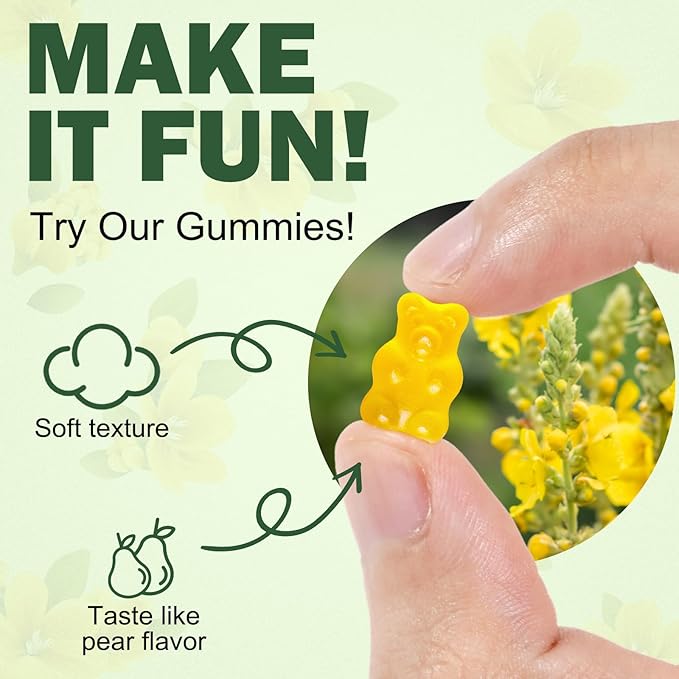 - Mullein Gummies for Lungs: Experience the rejuvenating power of natural mullein leaf extract gummies, as it naturally supports your lungs and helps enhance your respiratory health. Mullein gummies can effectively clean the lungs, providing powerful benefits for the respiratory tract and overall lung health