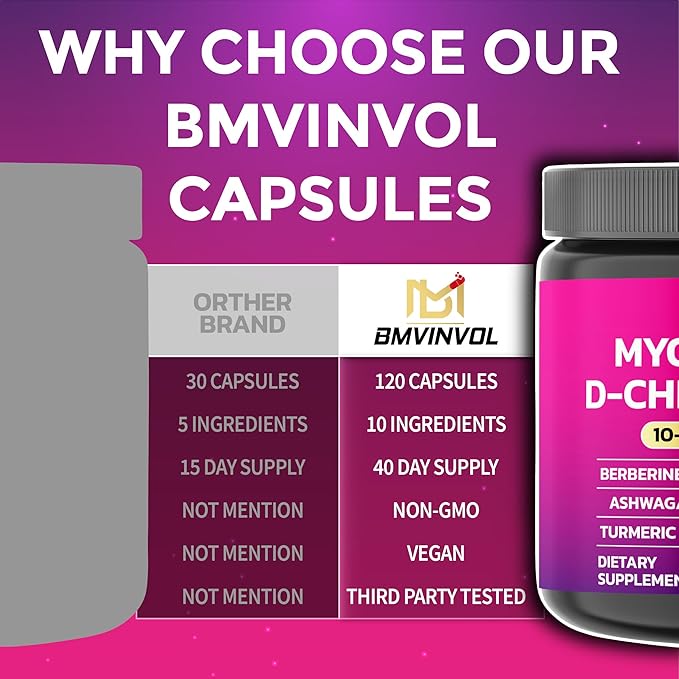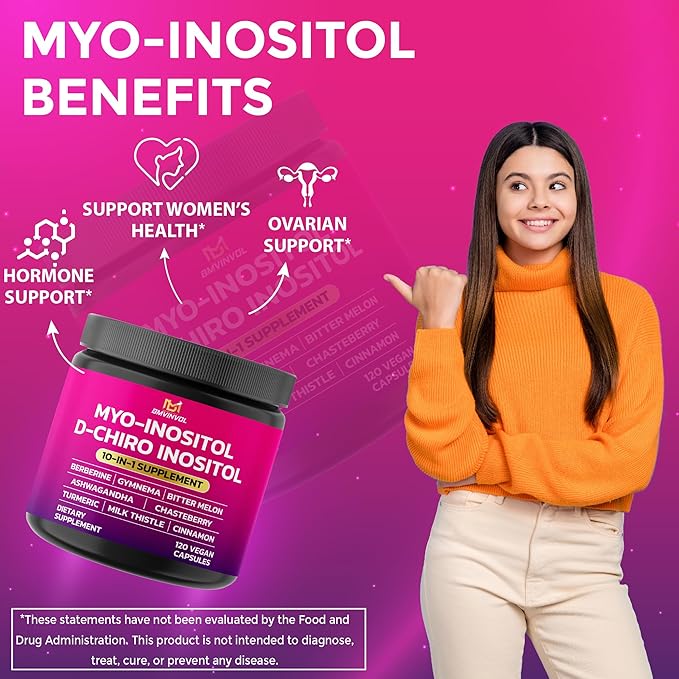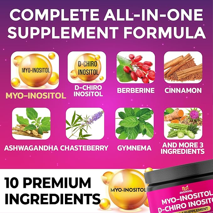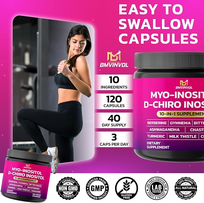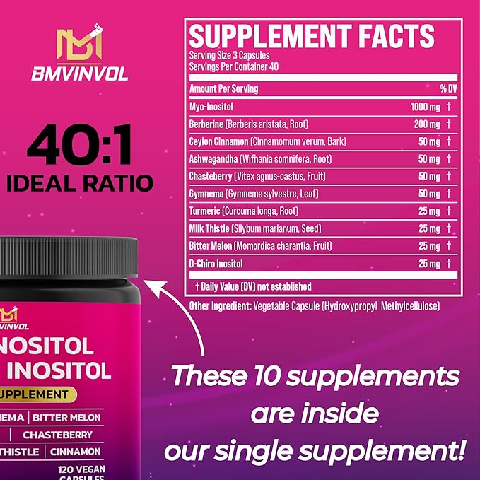 BMVINVOL Inositol Supplement - Myo-Inositol and D-Chiro Inositol Ideal 40:1 Ratio - Plus Berberine, Cinnamon, Ashwagandha + 5 More - 120 Capsules