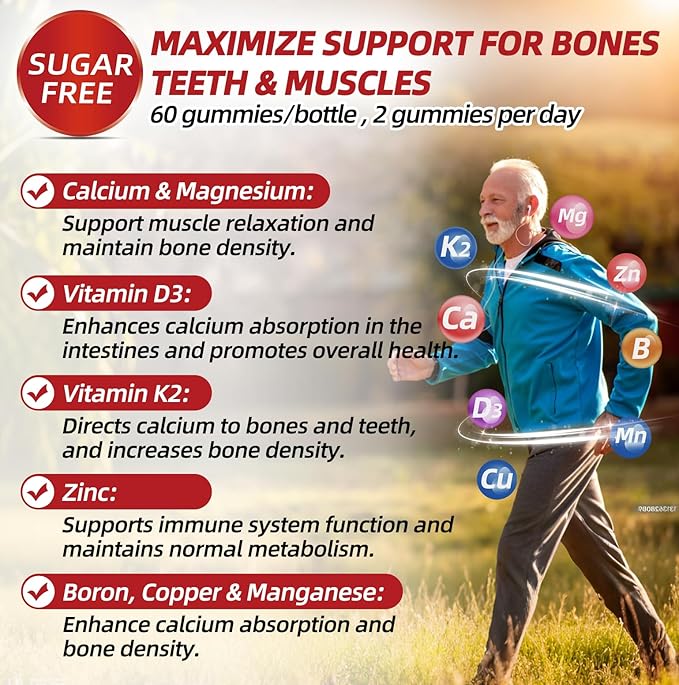 - ๐๐๐ฑ๐ข๐ฆ๐ฎ๐ฆ ๐๐ฎ๐ฉ๐ฉ๐จ๐ซ๐ญ ๐ ๐จ๐ซ ๐๐จ๐ง๐๐ฌ, ๐๐๐๐ญ๐ก & ๐๐ฎ๐ฌ๐๐ฅ๐๐ฌ: Vitamin D3 K2 supports muscle and body coordination while promoting intestinal absorption of calcium. The calcium-magnesium combination helps muscles relax and keeps bones healthy. In addition, Boron and Copper aid in calcium absorption, further strengthening bones. 60 count, you only need to take two calcium citrate gummies a day to meet your calcium needs.