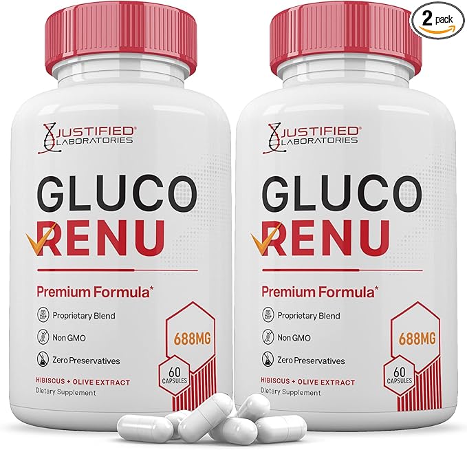 (2 Pack) Gluco Renu 688MG Glyco Support Pills Premium Formula Gluo Renew Glycogen Support Formulated Hawthrone Hibiscus Garlic Junpier Powder Olive Green Tea Extract 120 Capsules
