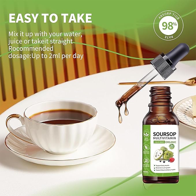 - HIGH ABSORPTION 98% - Unlike tablets, teas, powders, or capsules, our liquid formula is quickly absorbed into the bloodstream for faster results. Just 2 ml of our Soursop Liquid Drops per day provides a 30-day supply, offering long-lasting support. Shake well before use.