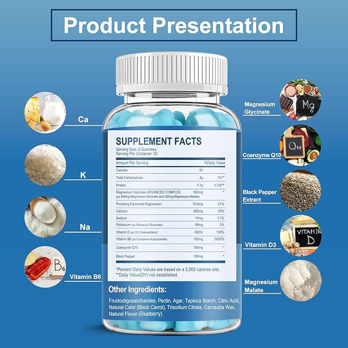- SYNERGISTIC FORMULA:Magnesium Gummies contain 400mg Magnesium Glycinate,200mg Magnesium Malate, 500mg Calcium, 99mg Potassium,Vitamin D3,B6,Coenzyme Q10 etc.Potassium and magnesium are two synergistic minerals that keep our body, mind and mood healthy. Vitamin D promotes the absorption of Calcium & Phosphorus,Vitamin B6 can participate in amino acid metabolism and conversion,promote body absorptioncan,Coenzyme Q10 and Black Pepper Extract promote digestive health,Magnesium Malate can help support cognitive health.